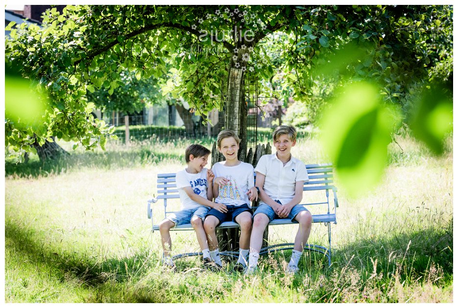 Door de zomerse warmte zochten we regelmatig de schaduw op tussen de fruitbomen. De kersenbomen gaven niet alleen verkoeling, maar ook een speelse, zomerse sfeer aan de beelden. Deze natuurlijke setting maakte de foto’s intiem en authentiek. Ik laat families altijd bewegen, lachen, knuffelen en genieten van elkaar. Zo ontstaat er een serie beelden die niet geposeerd, maar spontaan, levendig en natuurlijk zijn.